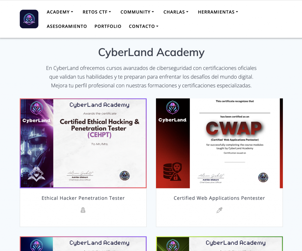 En CyberLand ofrecemos cursos avanzados de ciberseguridad con certificaciones oficiales que validan tus habilidades y te preparan para enfrentar los desafíos del mundo digital. Mejora tu perfil profesional con nuestras formaciones y certificaciones especializadas.